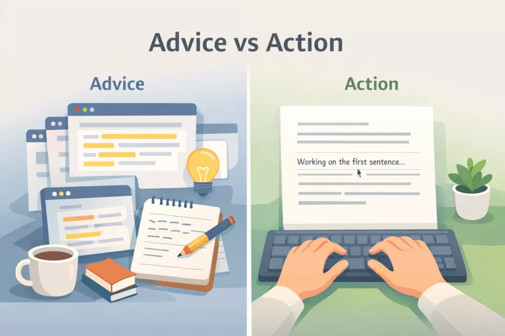 Reading writing advice feels like progress because it reduces anxiety and makes you feel informed. But real improvement only happens when you practice. Use one structure, repeat it, and write in short sessions. Guidance helps most when it pushes you into action and limits your choices.